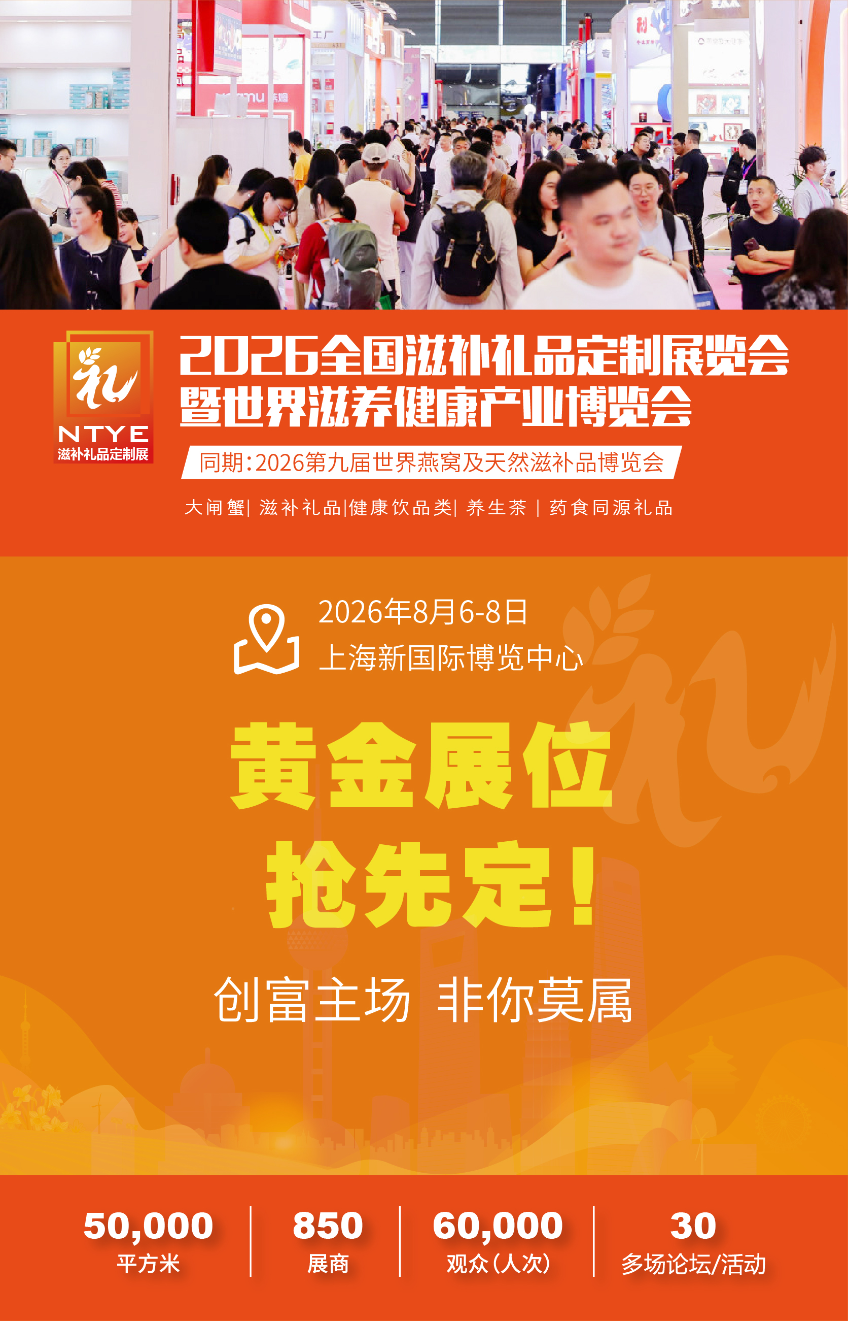 滋補選品節(jié)-上海燕博會暨世界滋養(yǎng)健康產(chǎn)業(yè)博覽會經(jīng)歷了多年的發(fā)展與資源積累,已成為燕窩與滋補產(chǎn)業(yè)領(lǐng)域具有知名度和權(quán)威性的行業(yè)盛會,各地政府、行業(yè)協(xié)會、產(chǎn)業(yè)園區(qū)、保稅區(qū)、合作伙伴、行業(yè)精英深度探討燕窩 與滋補產(chǎn)業(yè)發(fā)展,并保持緊密的合作。上海燕博會作為業(yè)內(nèi)頂尖行業(yè)盛會,期待各位攜手BST EXPO 2026繼續(xù)共同前行, 再創(chuàng)輝煌,給廣大客戶提供更優(yōu)質(zhì)、更專業(yè)、更全面的一站式解決方案。       同期舉辦“2026世界滋補產(chǎn)業(yè)生態(tài)大會、2026第十一屆酵博會、2026第八屆益生產(chǎn)品展、第十一屆月子健康展、滋補禮品定制展、營養(yǎng)健康展、世界蟹類展、全球有機食品展”等多展同期召開,預(yù)計總規(guī)模近50,000平方米展示面積,同期舉辦近30多場活動及論壇,匯集燕窩及滋補品行業(yè)上千家品牌匯聚專業(yè)買家60000多人次,圍繞“共創(chuàng)養(yǎng)生新時代,成就滋補大未來”;推動健康行業(yè)有序發(fā)展,作為行業(yè)風(fēng)向標(biāo),緊隨市場發(fā)展,全面覆蓋產(chǎn)業(yè)鏈,為行業(yè)搭建了一個技術(shù)交流、咨詢、合作(展示、代理、招商、加盟、銷售)、擴大上下游貿(mào)易、提高品牌和企業(yè)知名度一站式服務(wù)平臺。